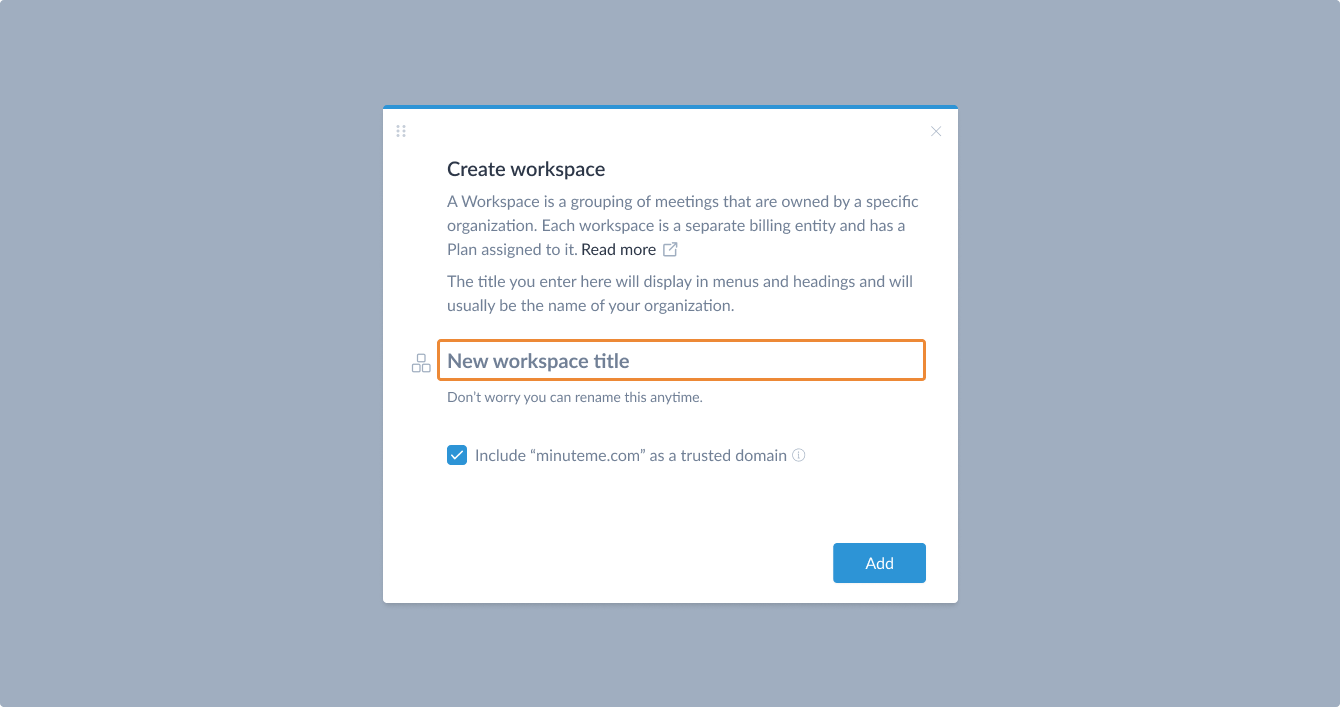A Workspace is a grouping of meetings that are owned by a specific organization. Every meeting created in MinuteMe is created within a workspace.