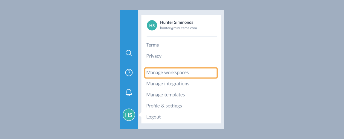 Access the Manage workspaces page from your user avatar on the left vertical menu: