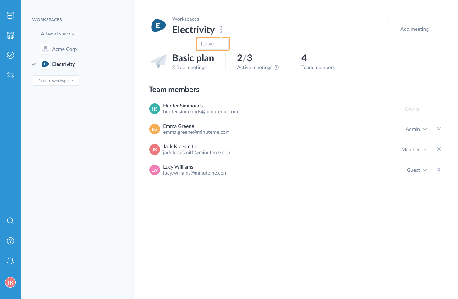Tip: If you are an owner of the workspace, the Leave workspace option is only available if there is another active owner in the workspace. The Leave workspace option is in the action menunext to the workspace name.