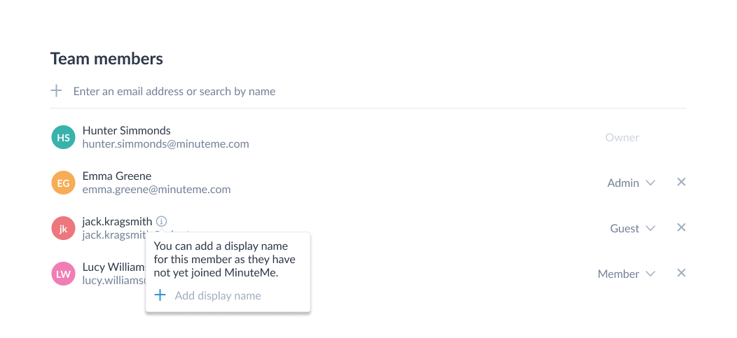 Tip: A new team member’s display name can be added and updated up until they first log in to MinuteMe. Click on the user’s name to open the dropdown. Enter a display name in the Add/Update display name input and press Enter.